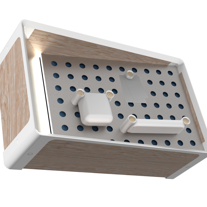 EchoGlow ultimately combines immersive acoustics, smart lighting, customizable storage, and a sleek shelf, presenting a stylish solution that helps users create an organized, distraction-free workspace.